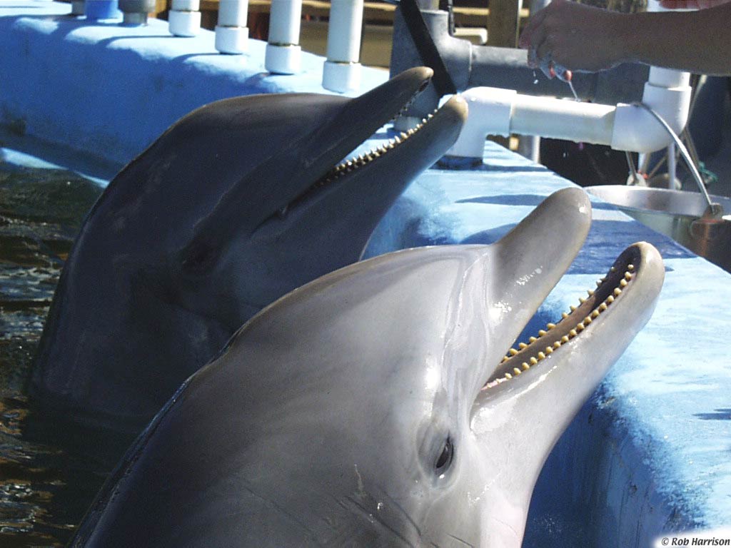 The other dolphin tank, the Hawaii Ocean Theater, is what I'd classify as a typical Sea World-style tank. It appeared about as large as one of the two tanks at the Dolphin Institute, but it was a bit deeper and had glass going all around it. It had seats going all the way around it like you would see at a theater, and there were smaller tanks at the back of the main tank with a number of other dolphins in them. I counted four dolphins in the main tank, and a few more in the back tanks.