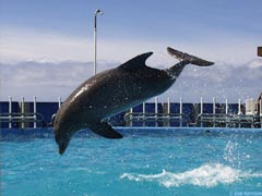 Id say the neatest thing about Ake is just how much she loves to figure stuff out. I put one of the foam noodle things in the tank along with a boogie board, and told Ake to straight jump over the noodle, and straight jump over the boogie board. She only jumped over the noodle the first time, so I sent her to do it again. She didnt even complain about sending her off right away, because I guess she knew shed done it wrong. If I remember correctly, she saw me motion the hand signals the second time (all four of them) and I could almost see her say to herself, "Oh, I know what to do now!" She did a quick jump out of the water as she went over to the foam noodle, where she did 2 jumps over it, and immediately went over to the surfboard and jumped over that a couple times. She came back, and was whistling and clicking like crazy, and I gave her a whole bunch of fish. Mike was