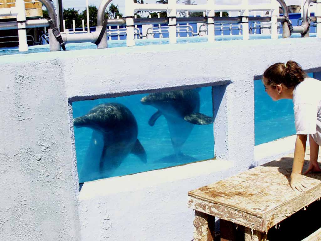 One thing in particular is worth mentioning. Just after pre-session, Hiapo and Elele were looking at us through the front lanai windows while myself and a few others just sat around and did nothing. They stayed there for quite a while, and were kind of squeaking a little, so I assumed they wanted to play. I got up and stood up on the platform in front of the windows to bring me up to their level. Immediately, Ellie (I like to call her that) popped her head up to the surface and stuck her rostrum (nose) through the gap in the guards where I was positioned. I said a few things, like "hey, hows it goin? You wanna play?", and since her rostrum was right in front of me, I leaned forward a little to give her a little kiss. Quite to my surprise, she pushed rather hard against my mouth when I did that. I was rather confused at the time, so I stepped down from the stand. She gave every indication that she just wanted to play, but I guess when she stuck her head out as far out of the rails as she did, I should have realized she might have been in a weird mood. It could be that she was just trying to get closer at the same time I did, but still... Ellie is proving more and more that shes quite the little trickster. I ended up doing the between trial interval timing for the Angular Resolution research session. I messed up once, but in the end it didnt matter anyway. Hiapo did way better today than he did yesterday, although the trials were designed to be easier today since the research was all but finished. We had a small lecture about a new task for the lab called session monitor. During a session, it is the session monitor's job to make sure the fish room is clean and free from Ajax residue, put ice in the fish buckets while the trainers are working with the dolphins, and change the fish bucket water if need be. Fairly simple. The idea being that everything is as sanitary and the fish are as fresh as possible. We attended a lecture on how to match humpback whale tail fluke photographs during 2nd session. The whale team at the facility is obviously short of people to help sort all the photos, so they asked the dolphin people to donate some of their time when they can. So far, I havent volunteered for it. At lunch hour, Scott gave a presentation on some research he did with Chimpanzies relative to object/symbol/sketch relationship. It was fairly interesting, although fairly long too due to Dr. Packs and Dr. Herman constantly adding things to the conversation. They made some good points relative to how Scott compared if A=B then therefore B=A when relating to language. Dr. Hermans comment was that if monkey=animal, animal is not equal to monkey, and so you cant use a mathematical definition for a language. I must admit, most of it was way over my head, but it was interesting nonetheless. After the lecture, I walked aimlessly around the tanks for while, checking out the dolphins moods to see if they wanted something to do.