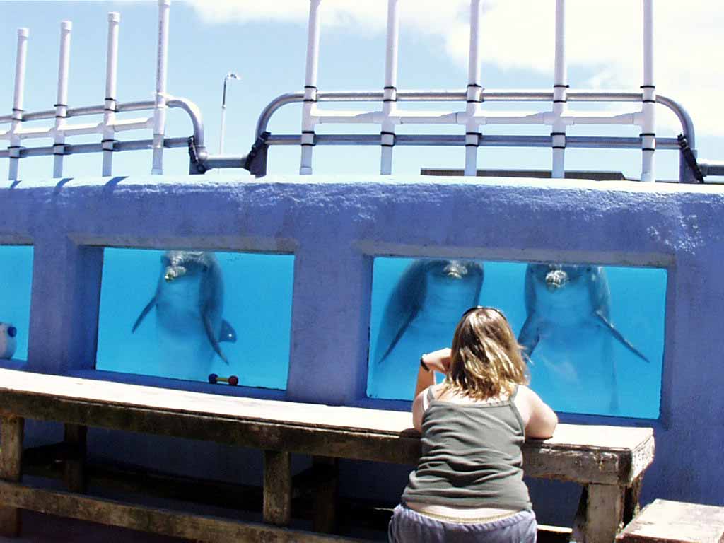 Sean has been great in describing some of the things the lab has done for research. Theyve done a bunch of studies into language, and actually trained Phoenix with an acoustic language relating to objects and actions. The problem was that when Phoenix tried to respond to questions, no real time response was possible since humans cant hear into a dolphins full acoustic range and youd need a computer to analyze the sound to give you an answer for it. Eventually, she just got bored of the lack of interaction and didn't want to do it anymore. They also trained Ake with a gestured language relating to objects, and Ake could actually respond to whether an object was present or not present. In one example, when asked to bring the Frisbee to the person, and there was no Frisbee in the tank, she actually brought the person to the "no" paddle without ever being trained to do that. Sean says that without a doubt its commonly assumed that Akeakamai is the smartest, or at least most educated, non-human on the planet. Apparently people have tried to recreate the experiments done in this lab without any success at all. I guess this facilitys training philosophies are better or the dolphins are just more eager to do things. Whatever it is, this is definitely the worlds most respected and advanced dolphin research facility. I feel very lucky to be part of it for even a short time. One of the new interns, Rachel, asked if I could film her "training practice" session for her. Since I had nothing better to do, I said itd be no problem. I was actually hoping that the informal style of the day would allow me to maybe help out with the feeding somehow, but I guess that was always a long shot. Oh well, maybe some other time. You could see that Rachel hadn't done many of these types of sessions. She was working with Phoenix, who had been having trouble doing front and back summersaults properly, so Rachels "task" was to have her do a front summersault and then immediately after do a back summersault. Interns are assigned these tasks as part of learning to become a trainer. She spent nearly the whole session working on it, but you could tell that Rachel wasn't totally confident in what she was doing while trying to complete the task. She didnt seem to be making the right decisions for what to tell Phoenix to do to complete the routine properly. She spent close to a half-hour trying different things unsuccessfully, only to have her supervisor walk in and get Phoenix to do it the first time. To be fair though, Rachel had already given Phoenix a good idea of what she wanted her to do, so the trainer was just finishing off the routine. As with many things, Im sure something like this takes a while to get good at, and it's easy for me to stand there and criticize while she actually had to do it. Sean and I decided to stick around and have a barbecue with a bunch of the guys from the lab in the front lanai section. It was dark when we got back from Safeway with the stuff we needed, which was quite a change from the normal blazing sun of the daytime that I was used to.