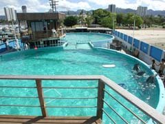 Everyone else was busy helping with the language session so I couldn't get any video of the session. Oh well. The only thing worth talking about was how Phoenix reacted to a combination I gave to her: spit tailwave straightjump. She went off, a little confused the first time, so I signaled again. She went off, jumped out of the water and spat out water, but then she brought her tail around and ended up doing a twisting jump instead. Alanna agreed it wasn't what I asked for, so I asked for it again. Same thing. She came back, and I gave her the tail wave command. She did that no problem. Then I asked for a tailwave striaghtjump again. She went off, jumped up, waved her tail a bit, but she still did more of a twisting jump than a straight jump. I think maybe she has trouble waiting until her tail's out of the water before she waves it around, and as a result she ends up pushing herself a little further out of the water than she wants and this results in a jump that looks like a twisting jump.