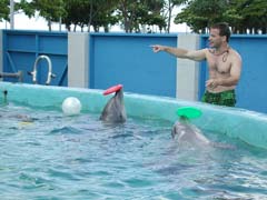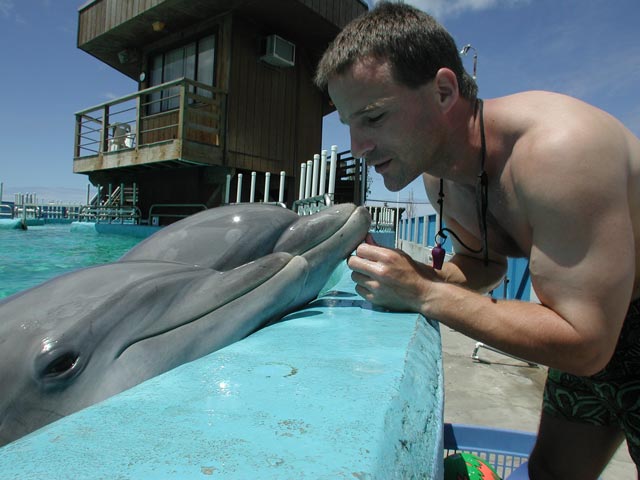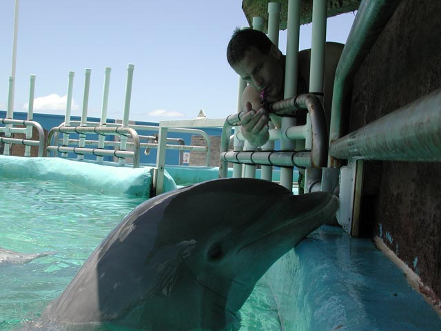 "Could you get down from there please?" I said, almost laughing at the guy's stupidity. I didn't bother to answer his question about the dolphins. I had to repeat myself again, but eventually he looked over at me and said, "No problem", and pulled himself down. I ran down from the tower immediately to find someone and told Mike about the whole deal once I managed to find him. Naturally, he was worried. This sort of thing happens occasionally, but very rarely. He went over to the staircase that overlooks the wall, and tried to see the guy who might have done it. A small group of kids were there hanging out and he talked to them briefly about what the facility was and how we can't have people hanging off the walls to try to see in. He told me they understood, and everything was cool, so we didn't give it any more thought. We just kept a closer eye on the walls from then on... Considering the number of people going by the lab and to the beach, incidents like this would be hard to prevent on a day like this (Memorial Day). A little while later, Mike and I discussed what he was planning on doing for the afternoon session. I had offered a few days ago to take pictures for him today, and he was once again overconcerned about getting everything perfect for the pictures. He reminds me of myself if I were in his situation... =) I told him not to worry, that I'd get all the pictures he could ever want, and that he should stop worrying about it and just focus on enjoying his last time with the dolphins. This was going to be his final session with them before he has to leave, but talk about a way to end it off! Training all three dolphins, with nobody watching except the camera man (me), unlimited time, and three dolphins in a great mood, it just doesn't get any better than that! I used Mike's camera to take the pictures this time, and alternated between video and still photos to document the session as well as possible. Mike did all the behaviours he could with them and managed to keep all three interested the entire session, even Hiapo. He tended to do things as a group more than Matthias had been doing, choosing to interact with the dolphins on a group basis rather than singling them out like Matthias.