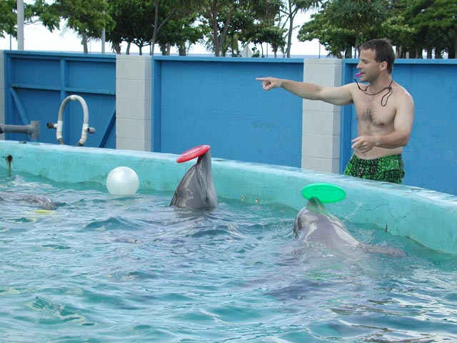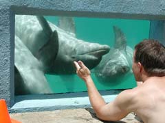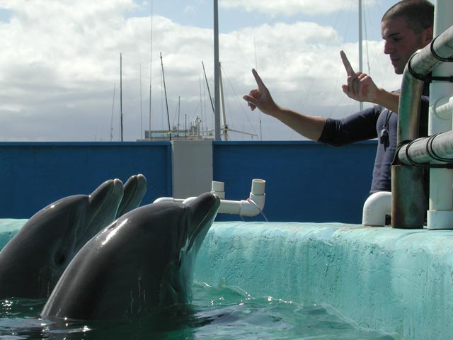 I arrived just after 9 o'clock to find Brian and Matthias at the lab, but nobody else. It was strange seeing so few people there in the beginning of the day. Brian is one of the residents at the lab and was just sort of hanging out, while Matthias was in the fish room getting fish ready for first session. I offered to help, but he was almost done and didn't need any, so I sat around in the tower and watched the dolphins while they played around with each other. Ake and Pho came over a few times and whistled at me in the tower in between Hiapo's onslaughts of chasing and sexual activity. He was being particularly aggressive towards Phoenix, chasing her and trying to bite her tail, but was leaving Ake alone basically. I guess she's just too fast for him so he didn't seem to bother chasing her that much. Once Matthias finished with fish duty, we talked about what would happen that session. He asked me if I wouldn't mind taking some pictures of him training the dolphins, especially digital ones, since he has so few of him working with all three and doesn't have any digital shots of him with the dolphins at all. Naturally, I was happy to do so considering how many sets of batteries I had charged for today; I had planned on taking tons of pictures anyway, and this gave me an excuse. I setup my video camera as well on the opposite side of the tank from where Mattias was planning on running the session so I would have a video record of the whole thing along with the pictures I was going to take. I do have to admit, I was hoping to get another shot at helping with training today, but this was only the second time I had seen Matthias train and I have a feeling he doesn't get to do it as often as he likes to. Working with all three dolphins must be even harder to schedule in. Matthias started the session quickly and without problem. For once, Hiapo didn't have any problem coming over and he stationed right away along with Akeakamai and Phoenix. I helped take some of the rails out, and began positioning myself for picture taking. It became evident within the first few minutes just how good Matthias is at working with the dolphins. It can be challenging working with one dolphin, but keeping things straight when working with three can be downright frustrating I'm sure. Not a problem for him! He actually managed to focus on each dolphin and anything they might have done or not done, all the while keeping it clear that he was speaking to only one of them. Usually the one needing talking to was Hiapo...=) All three dolphins were full of energy and put up a great show when asked for higher energy behaviours, with the possible exception of Hiapo. I think he knew that if he just did the bare minimum of what he was asked, he'd probably get away with it and still get rewarded. Nope, sorry pal. Matthias was aware of the times he did a half-assed behaviour or didn't do one at all, and would show him that he saw it and ask for it again sometimes. Other times, he'd just look sternly at him and give him a wait signal, but was quick to be energetic towards Akeakamai and Phoenix when they went out and did something correctly. Matthias' ability to keep the three seperated was what made it such an amazing session to watch, along with his generally humorous and entertaining approach to training. He did tend to keep close up behaviours, such as hugs and kisses, out of the routine, so it was hard to get personal style shots of him with the dolphins other than him standing straight up and the dolphins sitting at station. I did get a few though. I was very interested at the dolphin's inability to do one behaviour during the session.