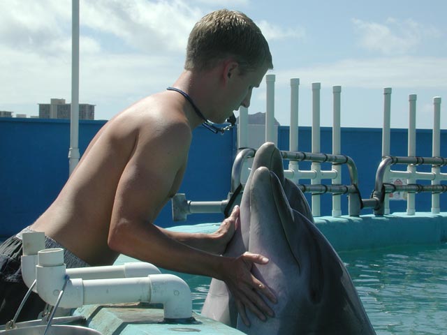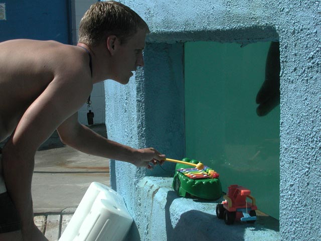 The new pump they installed at the facility is causing the water to be a little murky from the extra sand and stuff it is sucking up from the ocean, but it's nothing bad for the dolphins or anything. Actually, the cloudiness isn't bad at all, but it makes window pictures a little hard to make out from today, so that's why there aren't any up here. Tomorrow they've scheduled tank cleaning for the two tanks so the tanks are perfectly clean. That is one thing they've changed since last time I was here: they clean the tanks twice a week now. I'm sure it makes the job a heck of a lot easier if the algae hasn't had time to really start to build on the tank walls. If you ask me, the tanks really don't need a cleaning, but I guess that's the point. They needed a hand to get the cross-modal boxes out of the tank, and I was happy to jump in the tank and help out... no dolphins in the tank, but hey,