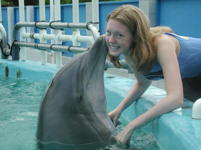 I decided to go second after Ashleigh. I stepped up, and immediately I could tell Phoenix was quite docile and not as high energy as I've seen her before. Actually, this has stayed consistant for every time I've ever worked with her, including last year.Robert was my trainer and was helpfull in suggesting things to try when I was running low on ideas. I told myself that one of the things I would try with her was some ball play, so once Phoenix had done a few jumps and swims, I stepped down and got a ball from the dolphin toy area. This is probably one of the most fun things you can do with a dolphin. Not only do they seem to really like doing it, it adds a very personal feeling of playing with them in a way they enjoy.